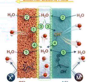 My current research focuses on bipolar membranes (BPMs) with the aim of understanding the fundamental physics of the bipolar junction, where water dissociation and ion generation occur under an applied electric field. Rather than evaluating BPMs only through overall performance metrics, my work seeks to identify the mechanisms that govern water dissociation, ion transport, and energy losses at the junction.